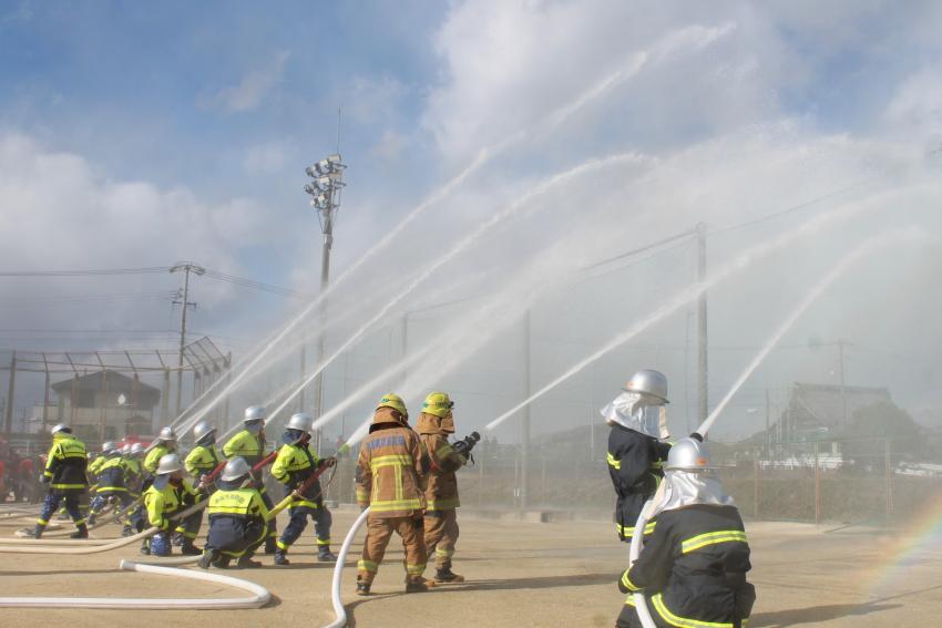 副団長の力強い号令とともに、消防ポンプ自動車から一斉に水が放たれました。筒先から勢いよく伸びた水柱は、令和8年の新春の空に美しいアーチを描きました。この放水には、今年一年が「無火災・無災害」であるようにとの、私たちの切なる祈りが込められています。