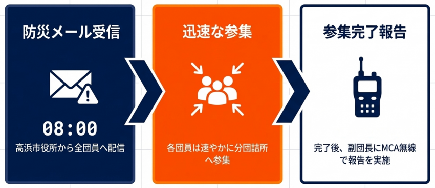 訓練当日の午前8時、高浜市役所から全団員へ一斉に防災メール(招集メール)が配信され、受信した団員は速やかに各分団詰所へ参集しました。参集完了後、MCA無線を使用し、訓練本部(副団長)へ迅速かつ的確な報告を行いました。