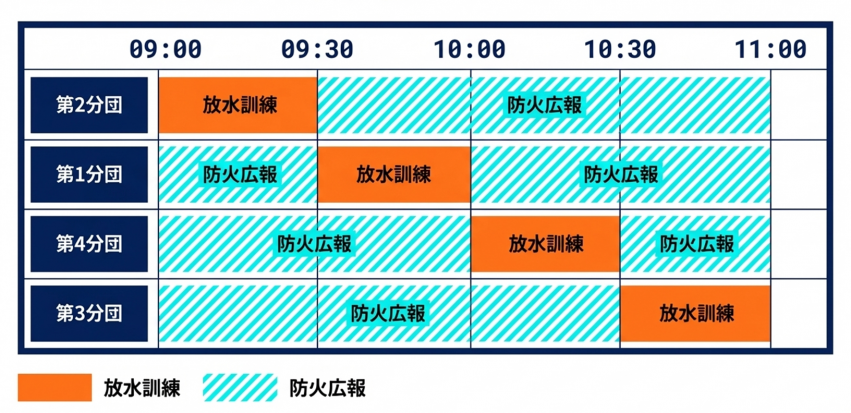 高浜消防署の職員は訓練の進行や安全管理を担当し、各分団の活動状況を確認しながら、より安全で効率的な放水活動について指導を行いました。団員は互いに声を掛け合いながら連携し、迅速かつ的確な動作で訓練に取り組んでいました。