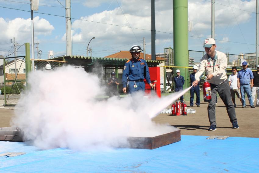 オイルパンに点火された炎を前に、消火器の操作方法を確認。実際に粉末を噴射し、火を消し止める一連の動作を体験しました。単なる座学ではなく、自らの手で操作することで「使える技術」として身につけることができました。
