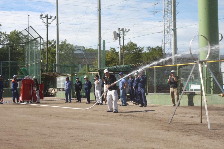続いて、2人1組で屋内消火栓を操作。ホースを延ばして火点に向けて放水を実施し、連携の重要性や設備の特性を学ぶことで、現場での即応力を養いました。